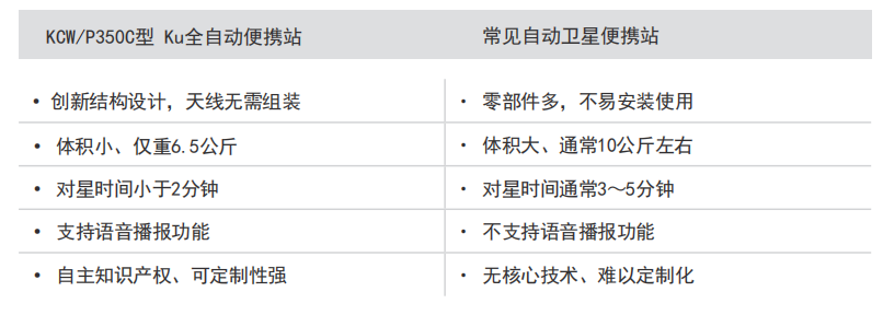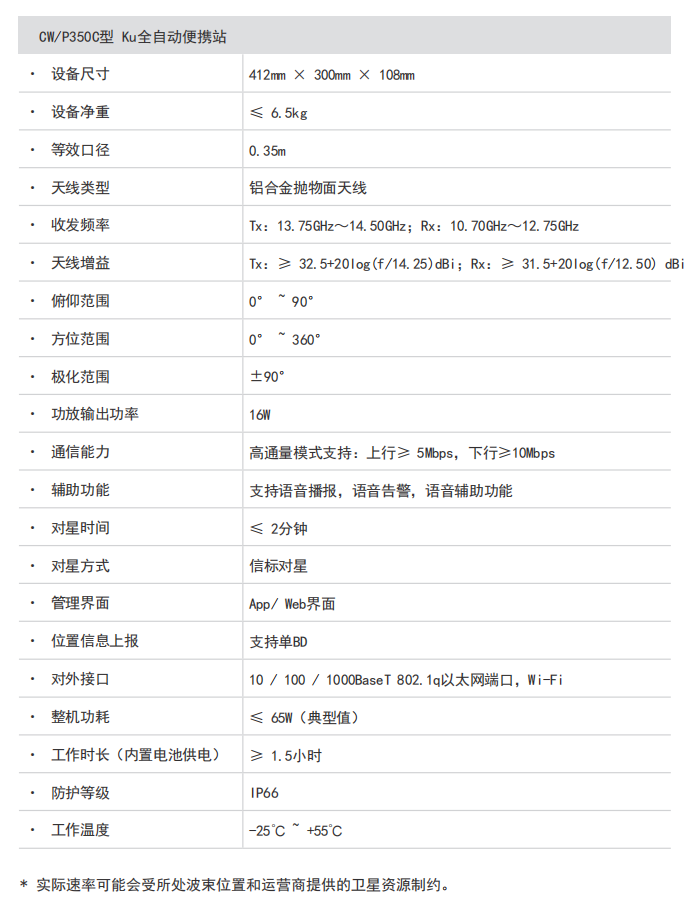 CW/P350C型Ku全自动便携站采用一体化结构设计,体积小巧,可轻松放入手提电脑包。设备配置整片0.35m口径铝合金抛物面天线,无需拼装,一键开机、一键收藏,2分钟内完成对星操作。设备可以接入Ku频段高通量卫星国产TDMA体制基带系统,带宽资源丰富,通信成本低。内置电池,工作时长不少于1.5小时。设备充分考虑抗风、高低温、低功耗等因素,能够满足各种使用需求。